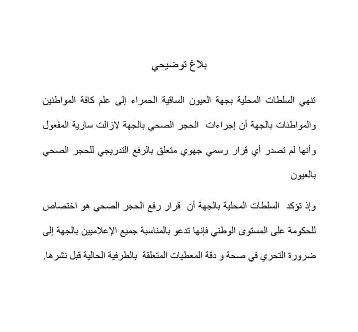 أصدرت السلطات المحلية بجهة العيون الساقية الحمراء بلاغ توضيحي إلى عموم ساكنة الجهة أن اجراءات الحجر الصحي بالجهة لازالت سارية المفعول ، وانها لم تصدر أي قرار رسمي جهوي متعلق بالرفع التدريجي للحجر الصحي بالعيون.