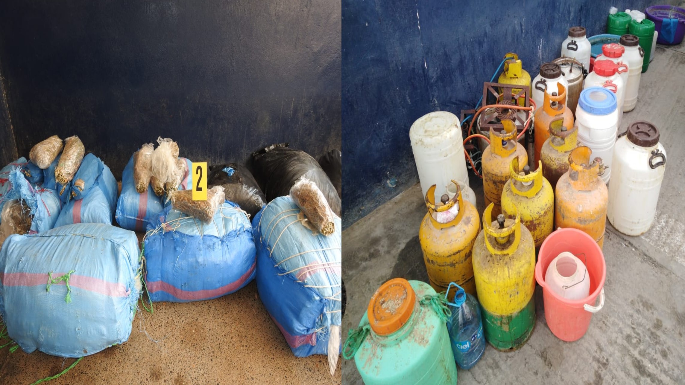 عملا بالمقتضيات القانونية لحالة التلبس تم إجراء تفتيش دقيق بداخل مسكنه أسفر عن حجز 150 كيلوغراما من سنابل “الكيف”، إضافة إلى 28 كيلوغراما من مادةاوراق التبغ الخام ” طابا”، كما تم تفكيك معمل تقليدي لصنع وتقطير مسكر ماء الحياة، وحجز 85 لترا جاهزة للإستهلاك من نفس المسكر، فيما جرى إتلاف 220 لترا من المواد المخمرة معبأة بداخل براميل.