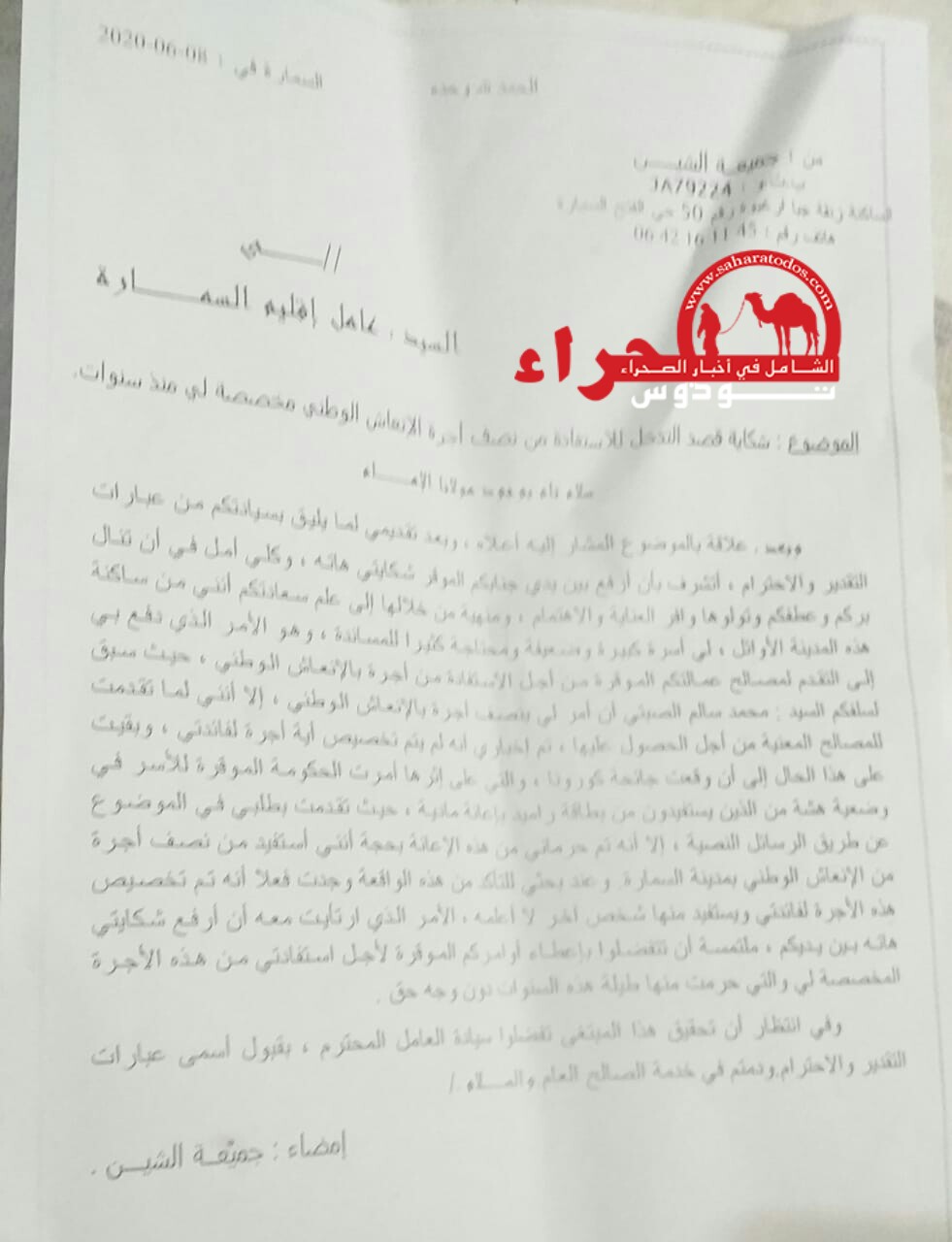 صاحبة أجرة الإنعاش المفقودة تراسل عامل إقليم السمارة قصد التدخل لإنصافها+وثيقة