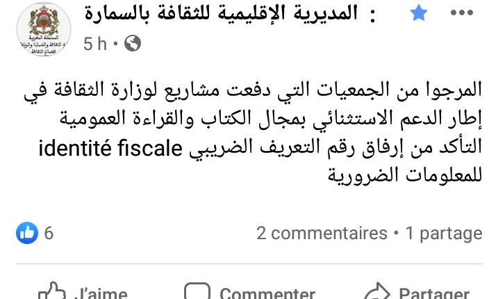 عبرت جمعيات ثقافية تشتغل في مجال الكتاب والقراءة العمومية بالسمارة عن إمتعاضها من إخبار أوردته المديرية الاقليمية للثقافة بالسمارة عبر صفحتها الرسمية في موقع التواصل الاجتماعي فايسبوك تخبر من خلاله الفعاليات الثقافية التي تقدمت بمشاريع لوزارة الثقافة في إطار الدعم الاستثنائي الذي تخصصه الوزارة للقطاع ،مشروط بشكل غير مفهوم بضرورة التأكد من رقم التعريف الضريبي ،وهو مايتنافى مع الجمعيات الغير ربحية وتعتمد على العمل التطوعي وهو مايسقط الشرط المتعلق بالتعريف الضريبي .