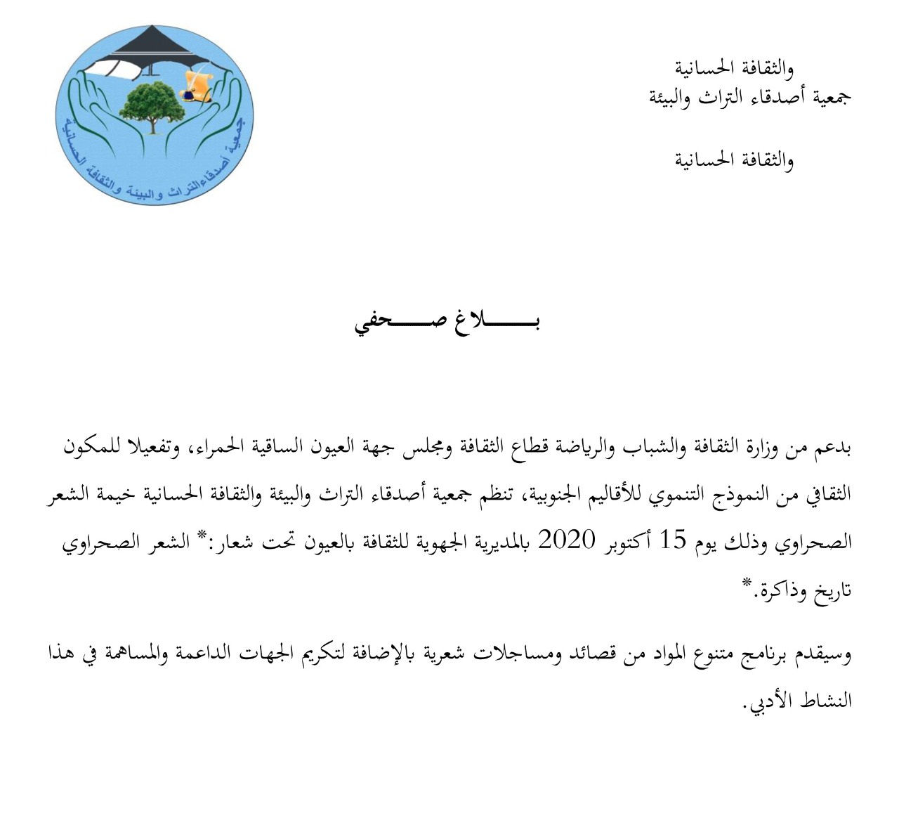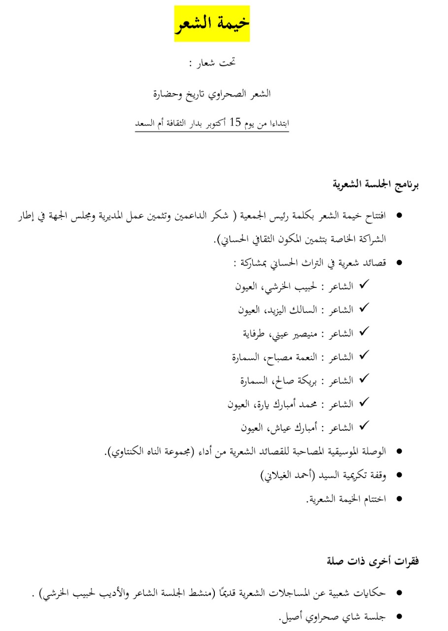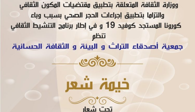 ثقافة توذوس العيون تحتضن خيمة شعر تحت شعار “الشعر الصحراوي تاريخ وذاكرة” By admin في أكتوبر 7, 2020 0 نشر صحراء توذوس العيون 0 نشر FacebookTwitterGoogle+WhatsAppالبريد الإلكترونيTelegram