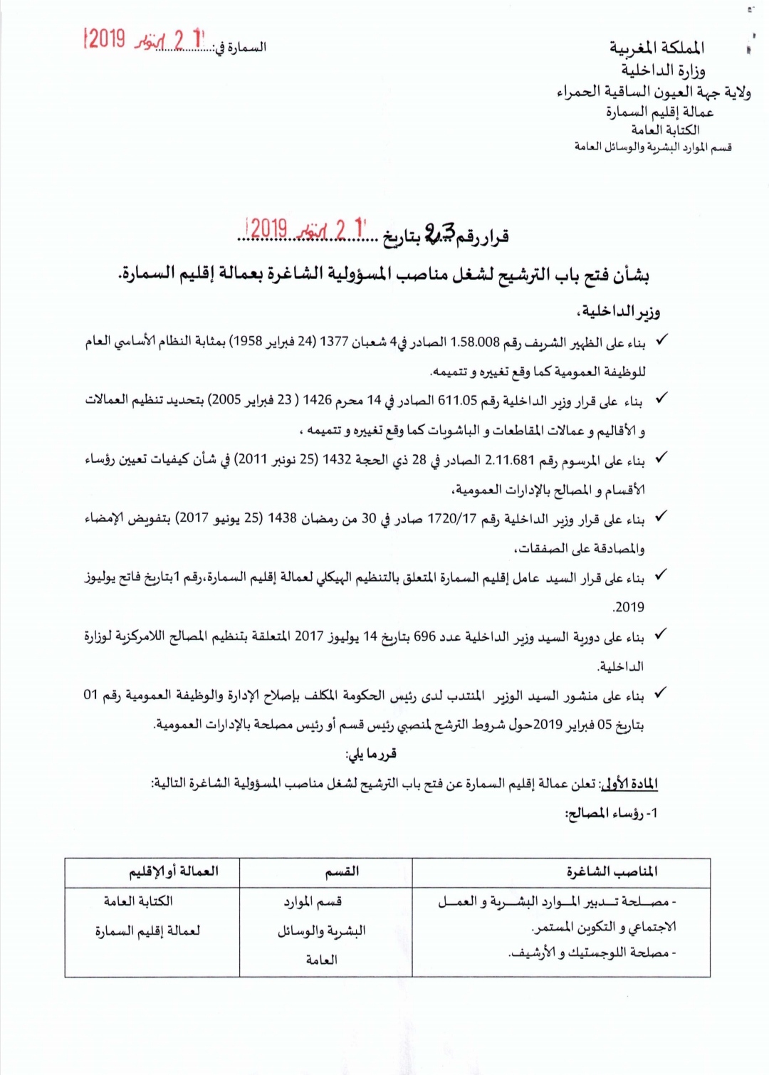 اللهم إذا كان المتبارون على المناصب الشاغرة بإقليم السمارة دون المستوى المطلوب ؟ علما أنهم يديرون هذه المصالح منذ عام بالهيكلة الجديدة !!
