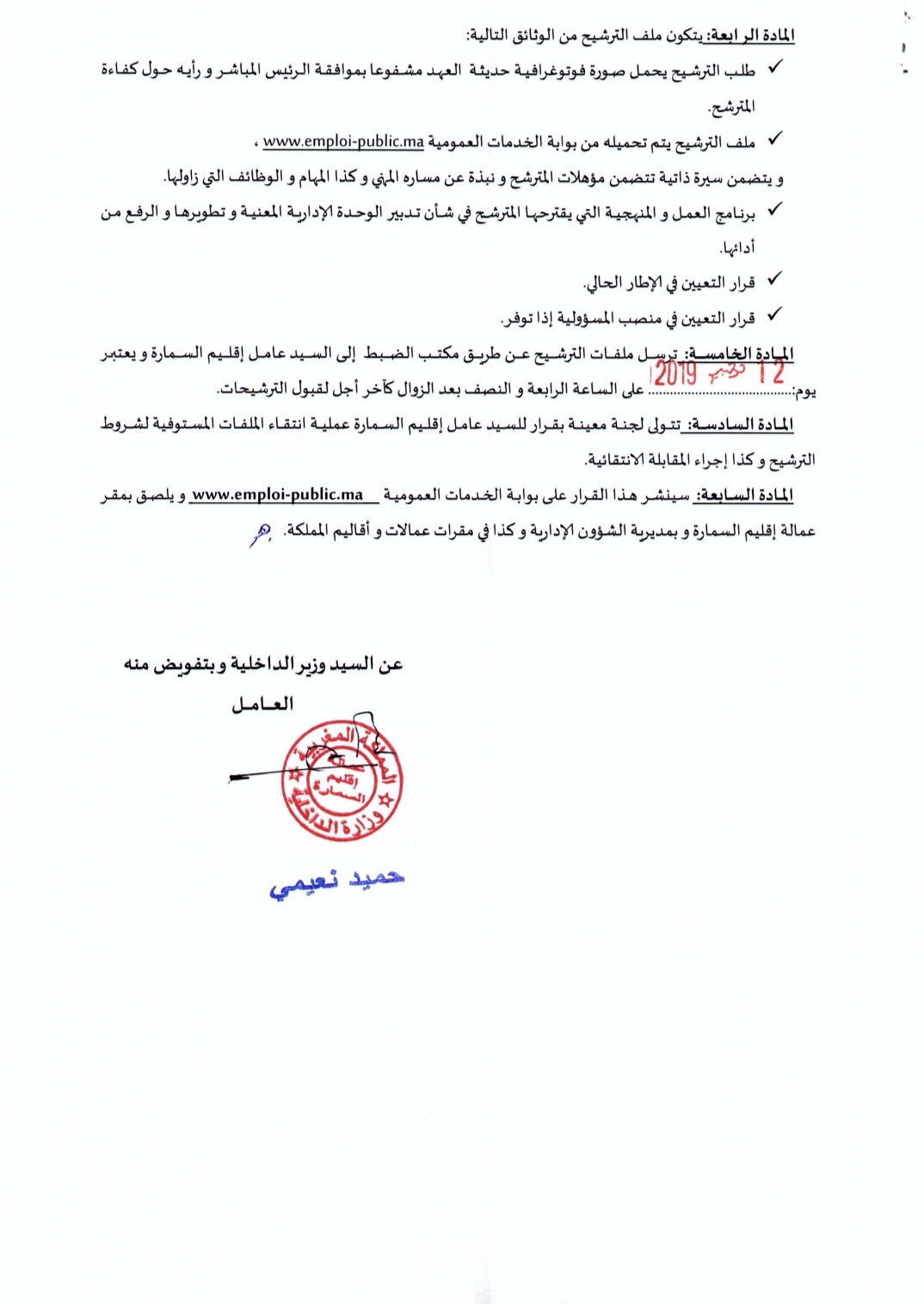 كانت عمالة إقليم السمارة سباقة في تنزيل التنظيم الهيكلي المتعلق بالعمالات بناءا على دورية وزير الداخلية عدد 696 بتاريخ 14 يوليوز 2017 المتعلقة بتنظيم المصالح اللامركزية بوزارة الداخلية ،فجاء قرار عاملي رقم 01 للسيد حميد نعيمي بتاريخ فاتح يوليوز 2019 يتعلق بالتنظيم الهيكلي لعمالة إقليم السمارة وتم إخراج الإعلان بفتح باب الترشيح لشغل مناصب المسؤولية الشاغرة في 15 مصلحة بعمالة إقليم السمارة بتاريخ 21 أكتوبر 2019 .