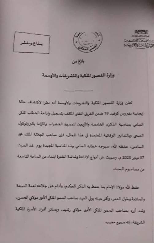 اعلن بلاغ صادر عن وزارة القصور والاوسمة انه “نظرا لاكتشاف حالة إيجابية بفيروس كوفيد 19 ضمن الفريق التقني المكلف بتسجيل وإذاعة الخطاب الملكي السامي بمناسبة الذكرى ال45 للمسيرة الخضراء، والتزاما بالبروتوكول الصحي وبالتدابير الوقائية المعتمدة في هذا المجال، فإن الملك محمد السادس سيوجه خطابه السامي بهذه المناسبة يوم غد السبت.