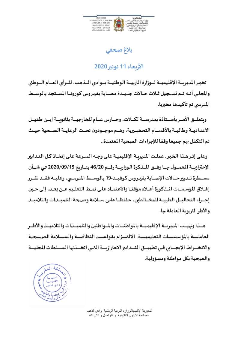 تربية وتعليم بسبب فيروس كورونا…إغلاق ثلاث مؤسسات تعليمية بإقليم وادي الذهب By admin في نوفمبر 11, 2020 0 نشر صحراء توذوس الداخلة 0 نشر FacebookTwitterGoogle+WhatsAppالبريد الإلكترونيTelegram