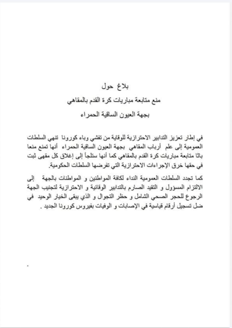 صحة توذوس بلاغ…ولاية جهة العيون الساقية الحمراء تمنع متابعة مباريات كرة القدم بالمقاهي By admin في نوفمبر 11, 2020 0 نشر صحراء توذوس العيون 0 نشر FacebookTwitterGoogle+WhatsAppالبريد الإلكترونيTelegram