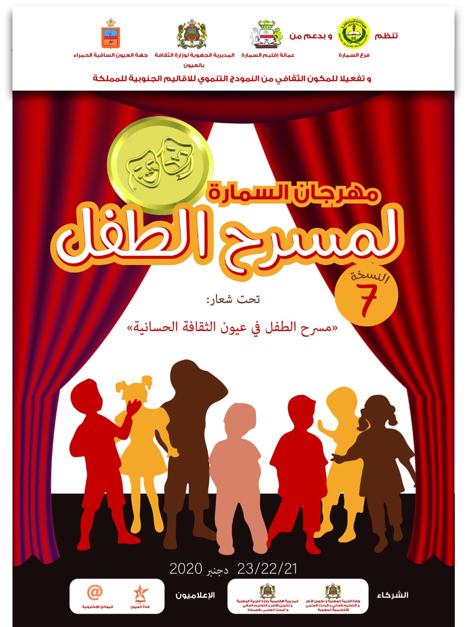 تنظم جمعية الشعلة للتربية والثقافة مهرجان السمارة لمسرح الطفل في دورته السابعة تحت شعار “مسرح الطفل في عيون الثقافة الحسانية أيام 22/21 دجنبر 2020 بدعم من المديرية الجهوية للثقافة بجهة العيون ومجلس جهة العيون الساقية الحمراء وبتنسيق مع المديرية الإقليمية للثقافة السمارة وتعاون مع عمالة إقليم السمارة .
