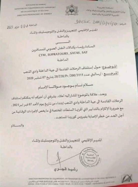 أصدر المدير الاقليمي للتجهيز والنقل واللوجيستيك والماء بالداخلة قرار موجه لرؤساء وكالات النقل العمومي للمسافرين بجهة الداخلة يخبرهم فيه بإستئناف الرحلات القادمة إلى الجهة .