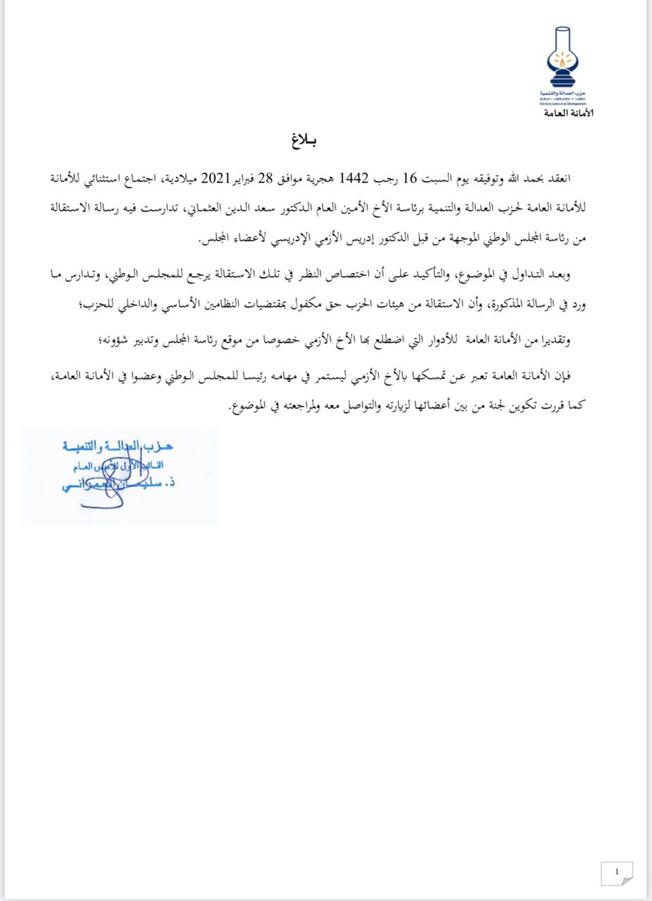 أخبار وطنية الأمانة العامة للبيجيدي تؤكد تمسكها بالأزمي رئيس للمجلس الوطني للحزب+وثيقة By admin في فبراير 28, 2021 0 نشر صحراء توذوس الداخلة 0 نشر FacebookTwitterGoogle+WhatsAppالبريد الإلكترونيTelegram