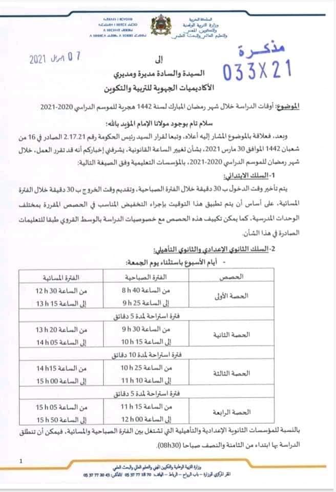 أماطت وزارة التربية الوطنية اللثام، قبل قليل من يوم الخميس، عن أوقات الدراسة خلال شهر رمضان لسنة 1442 هجرية، وذلك عبر بلاغ صادر عنها.