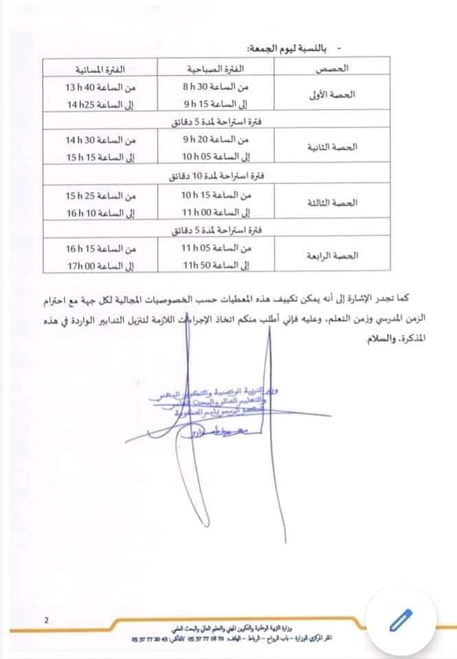 ووفق نفس البلاغ، فسيتم تأخير الدخول بـ 30 دقيقة بالنسبة للتعليم الابتدائي، خلال الفترة الصباحية، وتقديم وقت الخروج بـ 30 دقيقة خلال الفترة المسائية، على أن يتم تطبيق هذا التوقيت بإجراء التخفيض المناسب في الحصص المقررة بمختلف الوحدات الدراسة، كما يمكن تكييف الحصص مع خصوصيات الدراسة بالوسط القروي.
