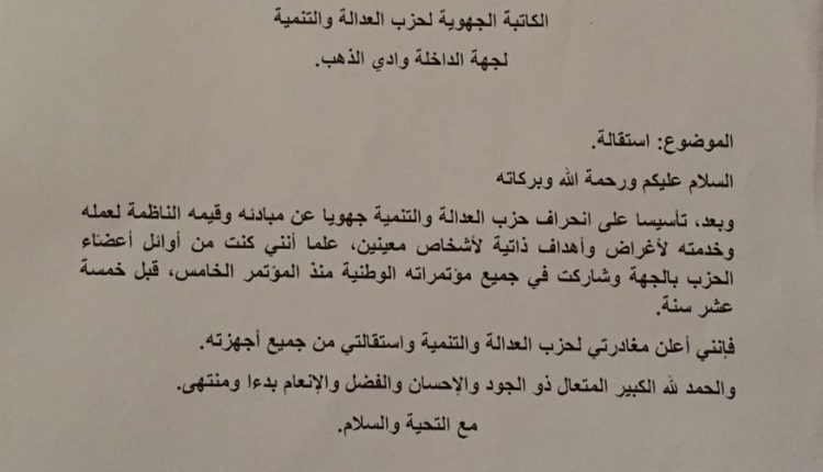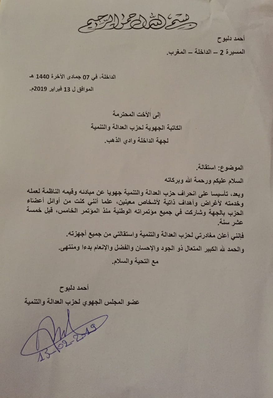 وثيقة / إستقالة عضو المجلس الجهوي لحزب العدالة والتنمية وإلتحاقه بحزب الحمامة بالداخلة قبيل لقاء أخنوش بالجهة