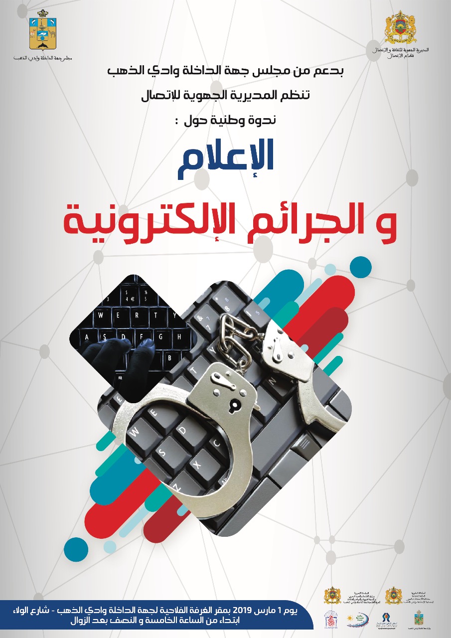 ستحتضن قاعة الندوات بالغرفة الفلاحية بجهة الداخلة وادي الذهب، يوم الجمعة فاتح مارس ، ندوة وطنية حول الاعلام و الجرائم الالكترونية، تنظمها المديرية الجهوية للاتصال بدعم من مجلس جهة الداخلة وادي الذهب و بشراكة مع ولاية جهة الداخلة وادي الذهب و المحكمة الابتدائية و اللجنة الجهوية لحقوق الانسان بالإضافة الى كليتي الاداب و العلوم الانسانية بوجدة و فاس.