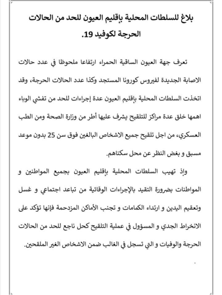 وأكدت سلطات ولاية العيون، في بلاغ لها توصلت “صحراء توذوس” بنسخة منه، إتخاذها مجموعة من الاجراءات بينها شمولية التلقيح بجميع المراكز الطبية العسكرية منها والمدنية للمواطنين ما فوق 25 سنة بدون موعد مسبق وبغض النظر عن محل سكناهم.