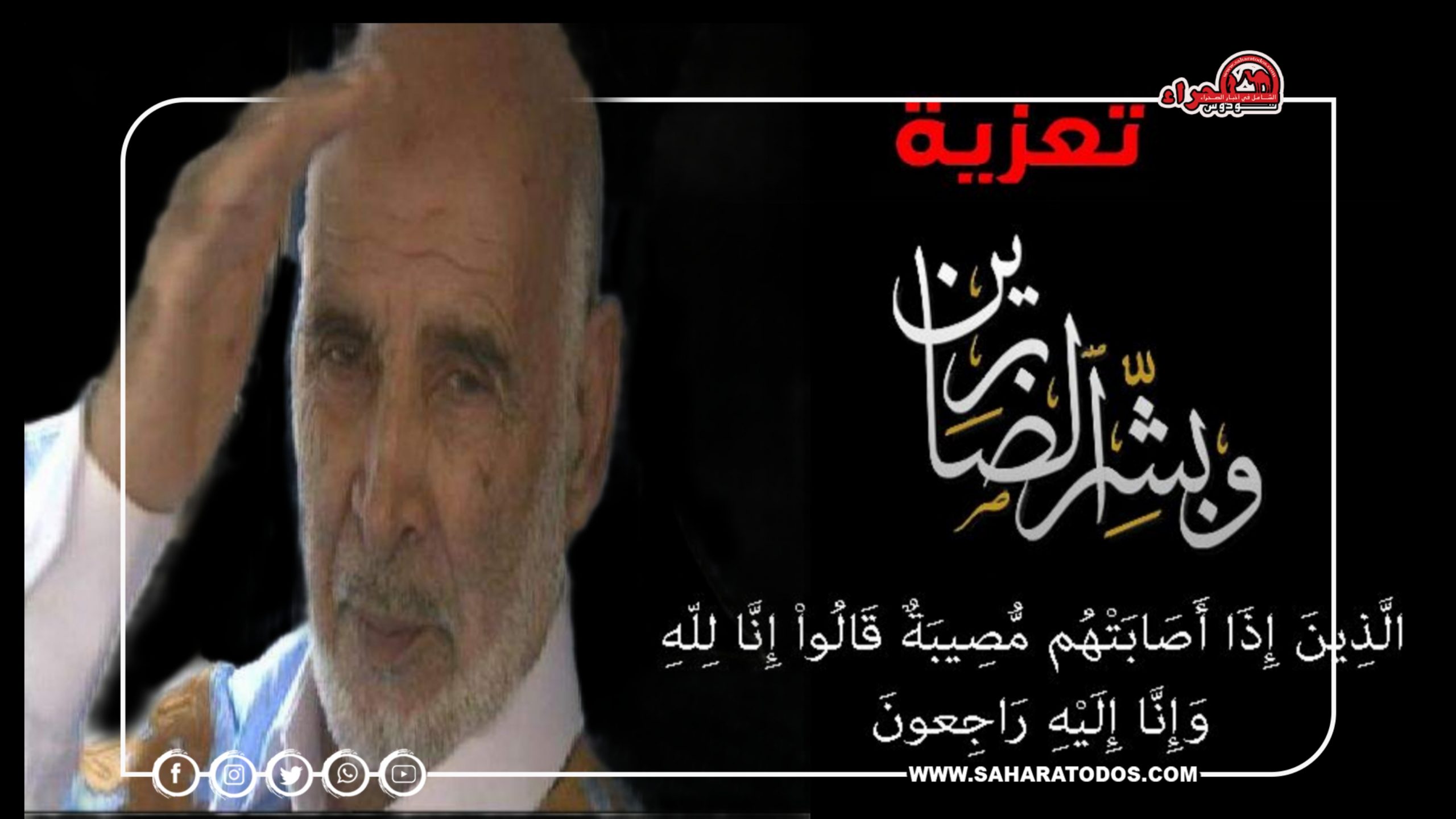 وبهذه المناسبة الأليمة تتقدم إدارة موقع “صحراءتوذوس”، بأحر التعازي والمواساة لعائلة المرحوم بإذن الله كبارا وصغارا، وجميع أفراد أسرته، سائلين المولى عز وجل أن يتغمد روحه الطاهرة برحمته الواسعة ويسكنه فسيح جناته ويلهم أهله الصبر والسلوان.