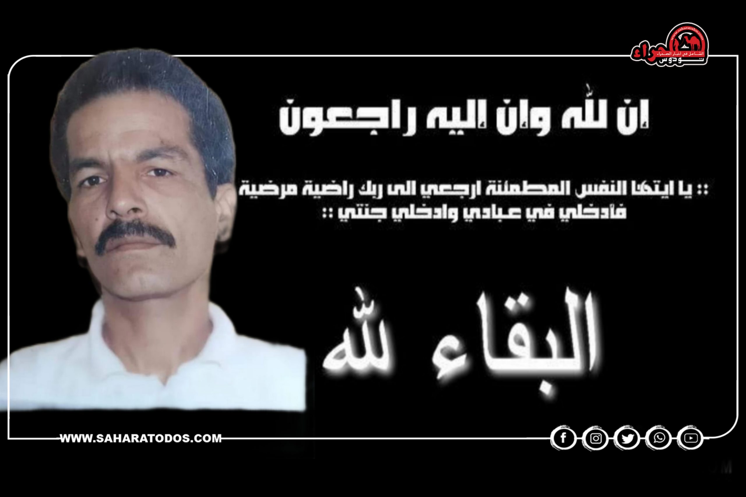 وبهذا المصاب الجلل وبقلوب مؤمنة بقضاء الله وقدره، تتقدم أسرة وطاقم “صحراء توذوس”، بأحر التعازي والمواساة لأفراد أسرة الزميل يوسف ولعائلة أهل كويرينة و أصدقائه سائلين الله العلي القدير أن يتغمده بواسع رحمته ويسكنه فسيح جناته ويلهم أهله وذويه الصبر والسلوان.