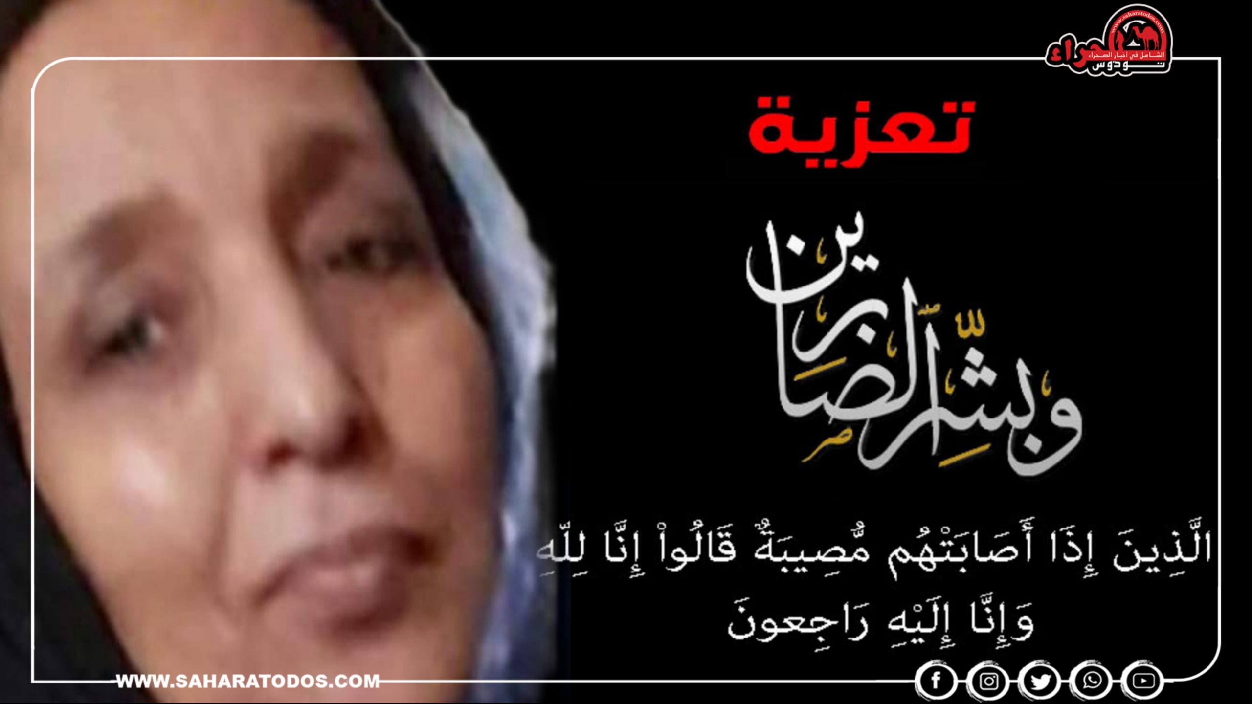 وبهذه المناسبة الأليمة تتقدم إدارة موقع “صحراءتوذوس”، بأحر التعازي والمواساة لعائلة المرحومة بإذن الله أهل الدخيل وأهل سبيدي والدكتور مراد الرامي، وجميع أفراد أسرتها، سائلين المولى عز وجل أن يتغمد روحها الطاهرة برحمته الواسعة ويسكنها فسيح جناته ويلهم أهلها الصبر والسلوان.
