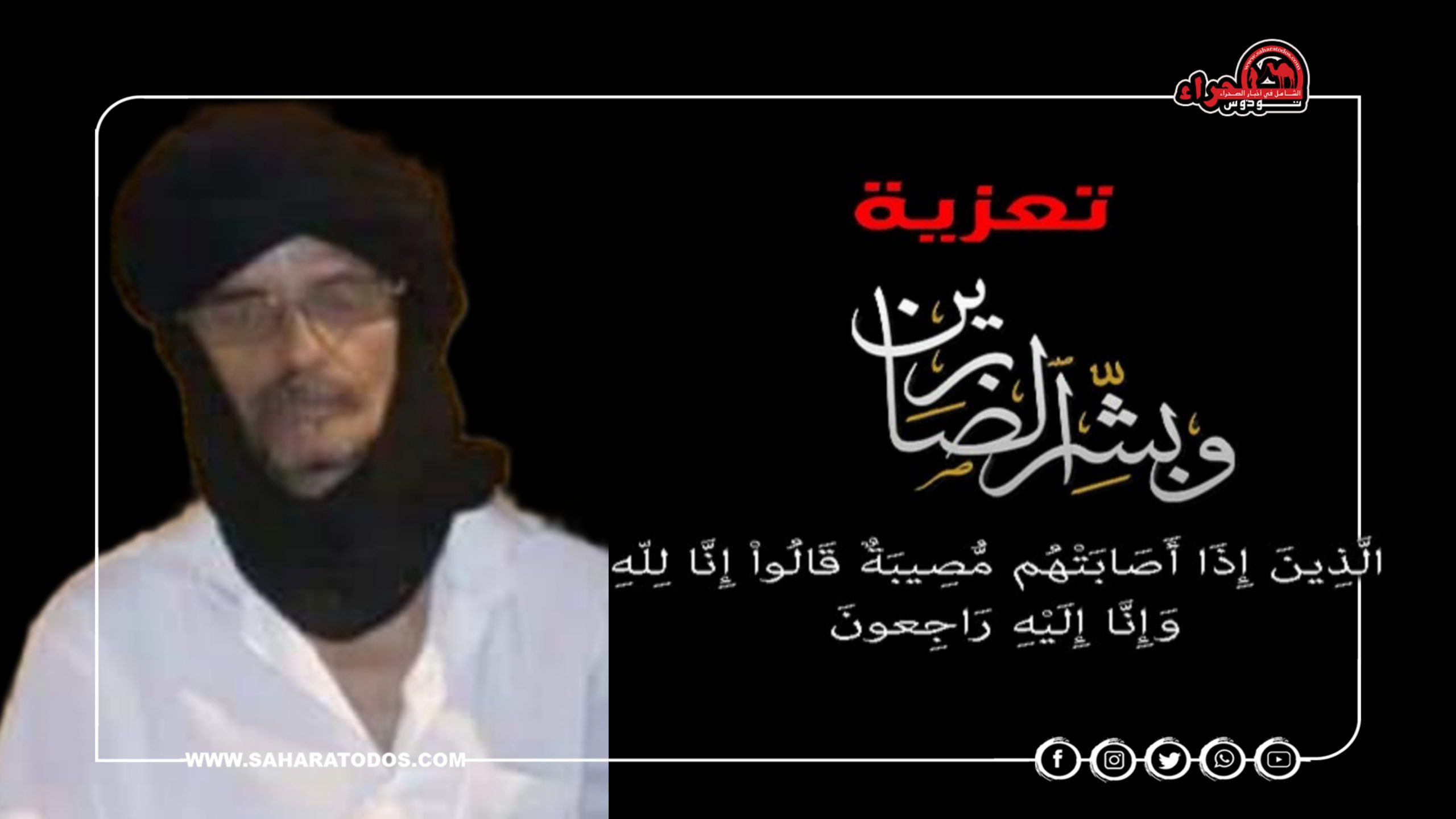 وبهذه المناسبة الأليمة يتقدم طاقم “صحراء توذوس” بأحر التعازي القلبية الصادقة لعائلة أهل حنيني وقبيلة الركيبات الفقرة التي يعد الفقيد أحد شخصياتها الوازنة ورموزها الكبار.