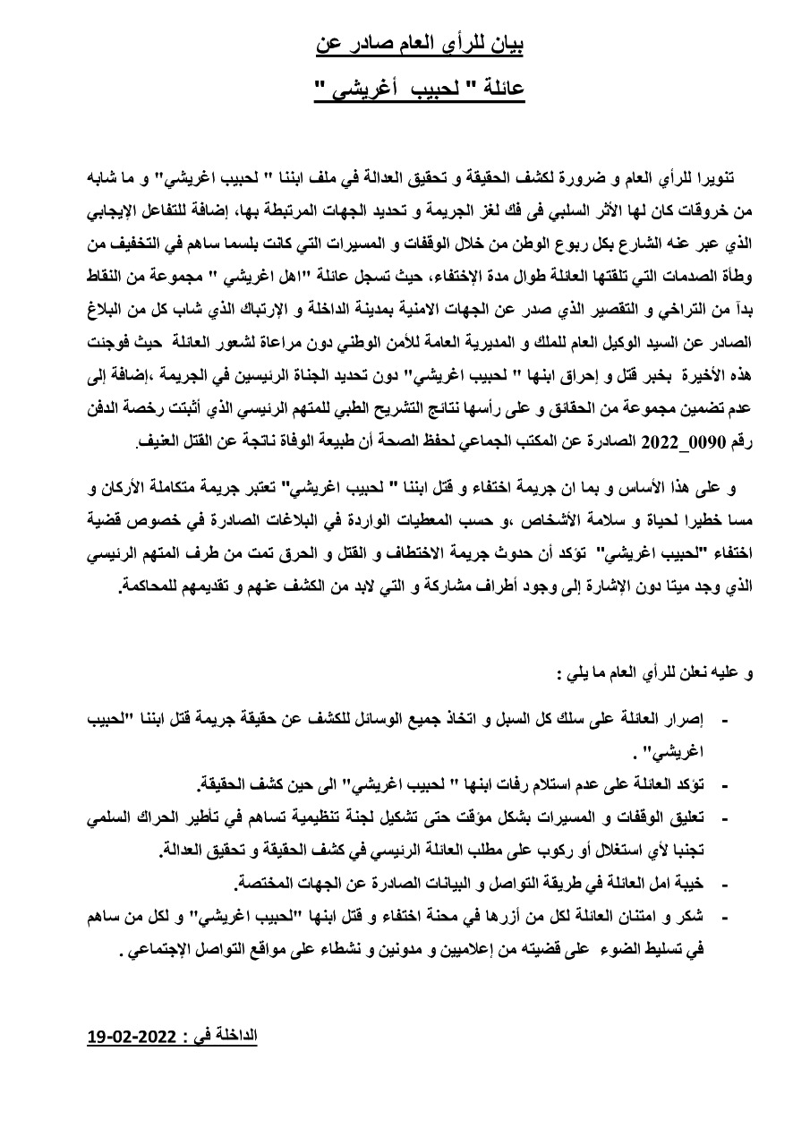 أخبار جهوية الداخلة.. عائلة “اهل اغريشي” تعلن عن تعليق الوقفات والمسيرات الإحتجاجية By admin في فبراير 19, 2022 0 نشر صحراء توذوس : الداخلة 0 نشر FacebookTwitterGoogle+WhatsAppالبريد الإلكترونيTelegram