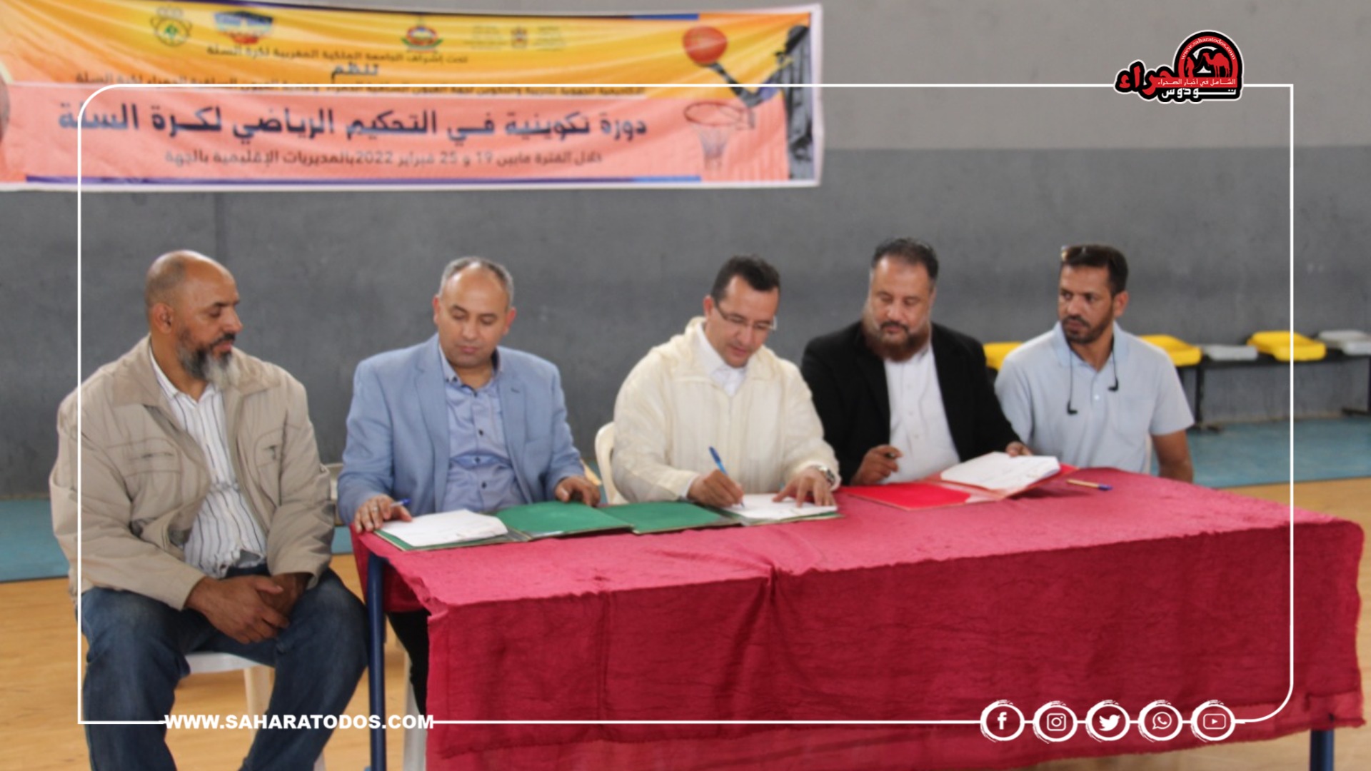 وقع كل من مولاي ابراهيم شريف رئيس عصبة العيون الساقية الحمراء لكرة السلة وعبد اللطيف مقداد أمين مال الجامعة الملكية المغربية لكرة السلة، وأمجد تهبوش الكاتب العام للجامعة، على عقدة الأهداف بين العصبة والجامعة من أجل النهوض بكرة السلة على مستوى جهة العيون الساقية الحمراء.