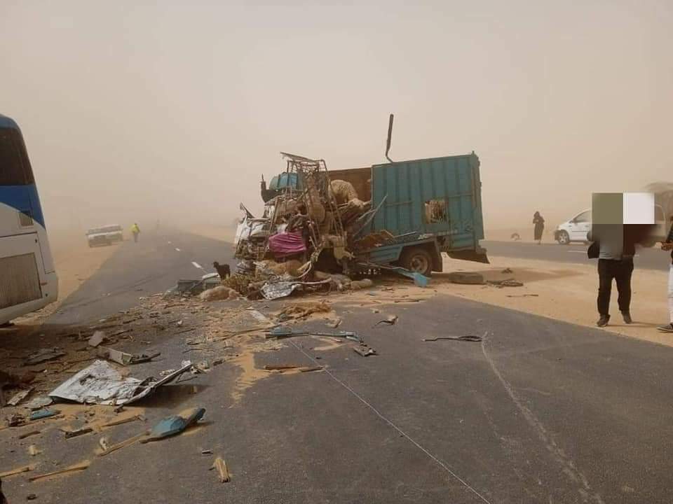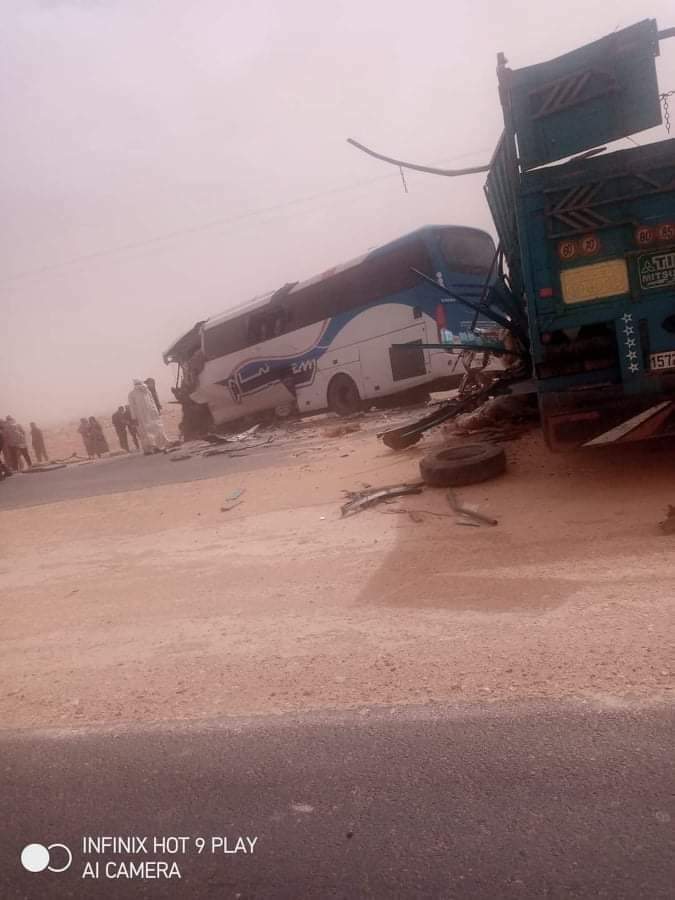 وحسب مصدر موثوق، فإن الحادث المميت سببه وقوع اصطدام قوي بين حافلة للركاب المسافرين” ستيام ” وإحدى شاحنات نقل المواشي، إثر إنعدام الرؤية والزوابع الرملية وسوء الأحوال الجوية.