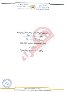 أصدرت وزارة التربية الوطنية والتعليم الأولي والرياضة المقرر الوزاري الرسمي الخاص بتنظيم السنة الدراسية 2023/2022، الذي يهدف إلى تحديد مختلف المحطات والعمليات والأنشطة المبرمجة برسم السنة الدراسية المقبلة بالأسلاك التعليمية الثلاث (السلك الابتدائي والسلك الثانوي الإعدادي و السلك الثانوي التأهيلي) وأقسام التحضير لشهادة التقني العالي وأقسام التربية غير النظامية، مع مواعيد إنجازها وتواريخ إجراء المراقبة المستمرة والامتحانات الإشهادية، وكذا مباريات التميز وامتحانات الكفاءة المهنية والتربوية.