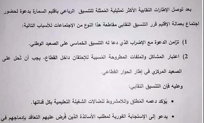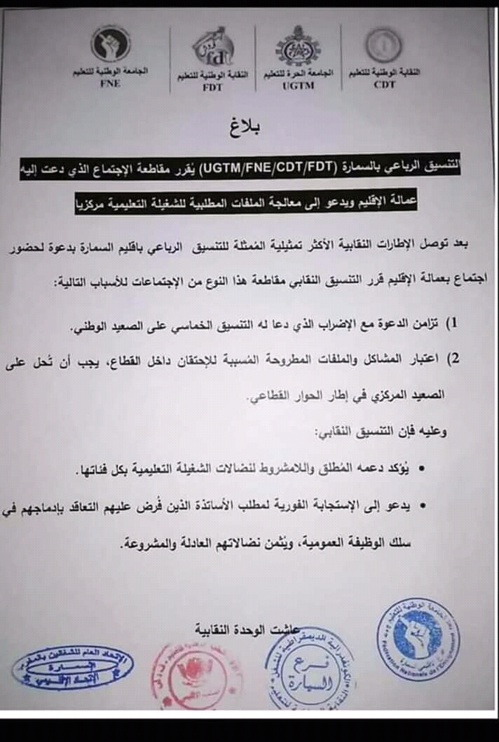 توصلت “صحراء توذوس” ببلاغ موقع من طرف أربع نقابات بإقليم السمارة يقرر مقاطعة الإجتماع الذي دعت إليه عمالة الإقليم ،كما يدعو من خلال البلاغ إلى ضرورة معالجة الملفات المطلبية للشغيلة التعليمية مركزيا .