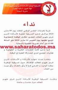 دعت التنسيقية المحلية للأساتذة المتعاقدين إلى وقفة إحتجاجية من المزمع تنظيمها يوم غد الخميس 14 مارس 2019 على الساعة 00 : 11 أمام المديرية الإقليمية بالسمارة.