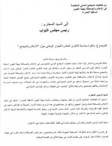 رفعت فعاليات المجتمع المدني المختصة في الإعلام والصحافة بجهة العيون الساقية الحمراء مذكرة إلى رئيس مجلس النواب، حول موضوع: مذكرة بمناسبة الذكرى العاشرة للحوار الوطني حول “الاعلام والمحتمع”.