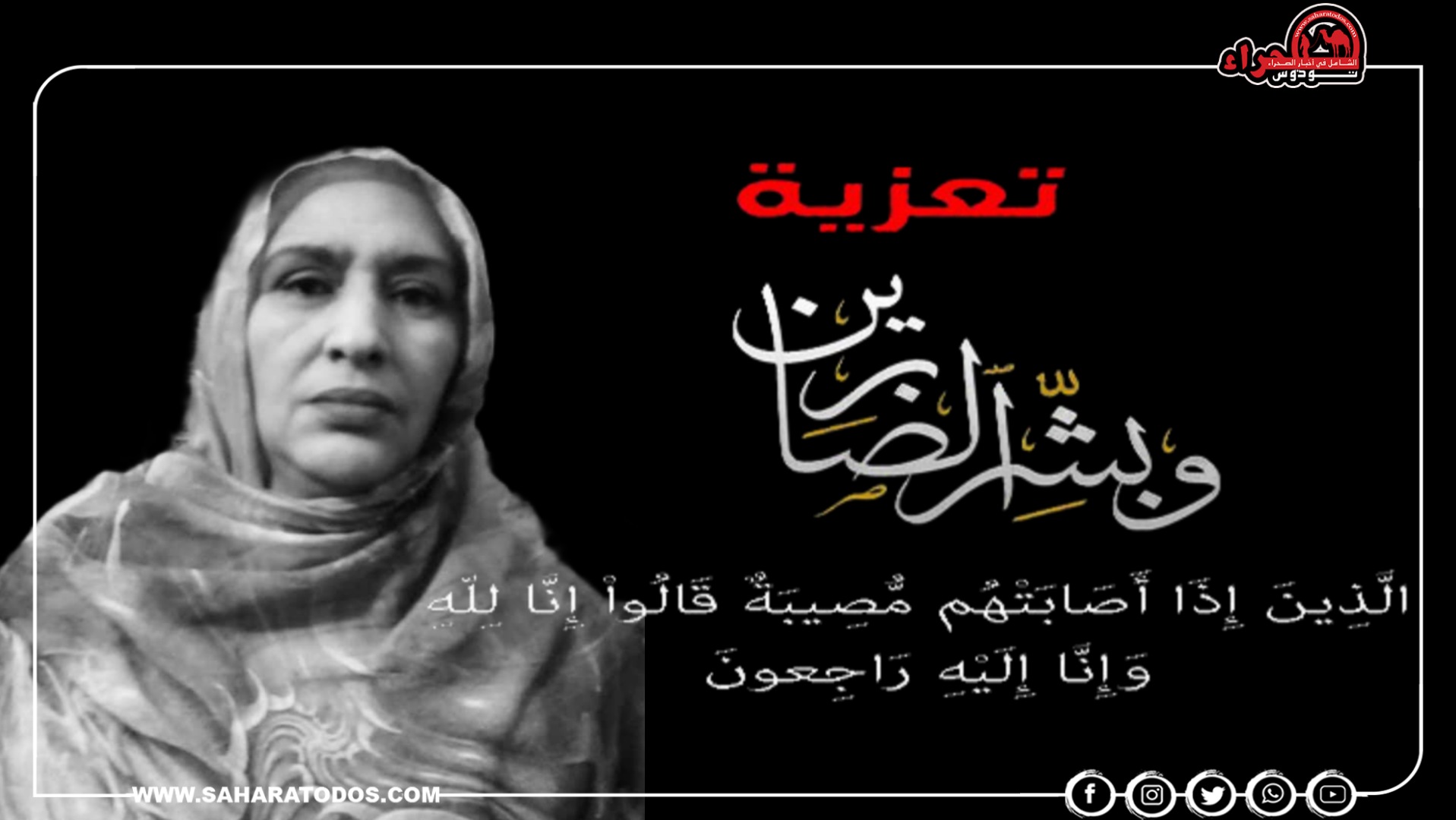 وبهذه المناسبة الحزينة يتقدم طاقم إدارة جريدة “صحراء توذوس” بأحز التعازي والمواساة القلبية إلى كل أفراد وعائلة الفقيدة وكافة أقاربها، وعموم ساكنة السمارة.