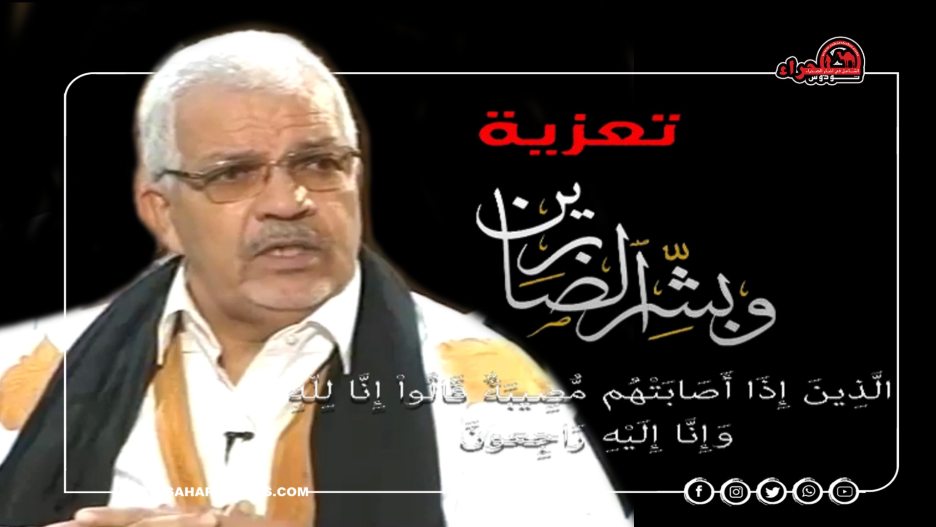 وبهذه المناسبة الأليمة يتقدم طاقم “صحراء توذوس” بأحر التعازي القلبية الصادقة لعائلة الفقيد محمود ولد أحمد ولد البشير وإبنه البار البشير الداودي القائد بالإدارة الترابية وكافة قبيلة أولاد داود ركيبات وعموم الساكنة المحلية بالعيون.