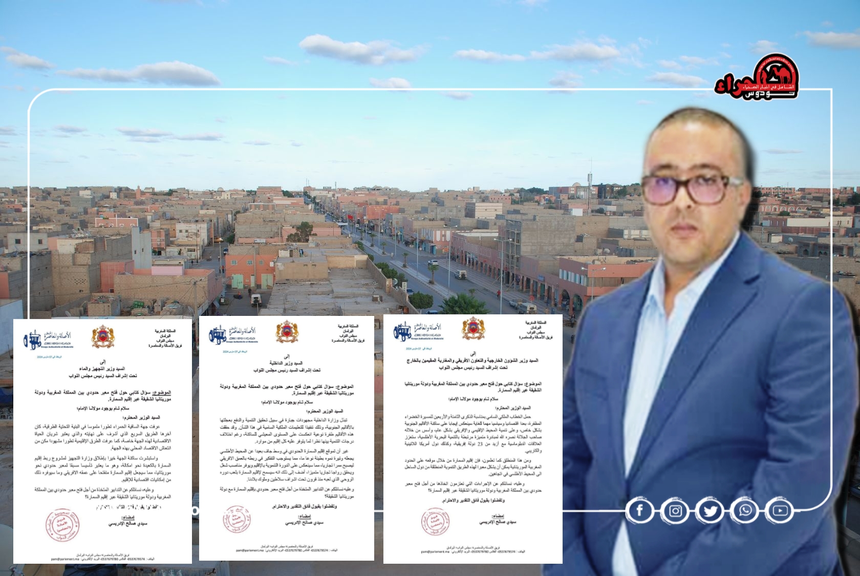 وجه اليوم الخميس، النائب البرلماني بمدينة السمارة، سيدي صالح الإدريسي ثلاث أسئلة كتابية لكل من وزراء الخارجية والداخلية والتجهيز، بخصوص التدابير المتخذة من أجل فتح معبر حدودي بين إقليم السمارة وموريتانيا.