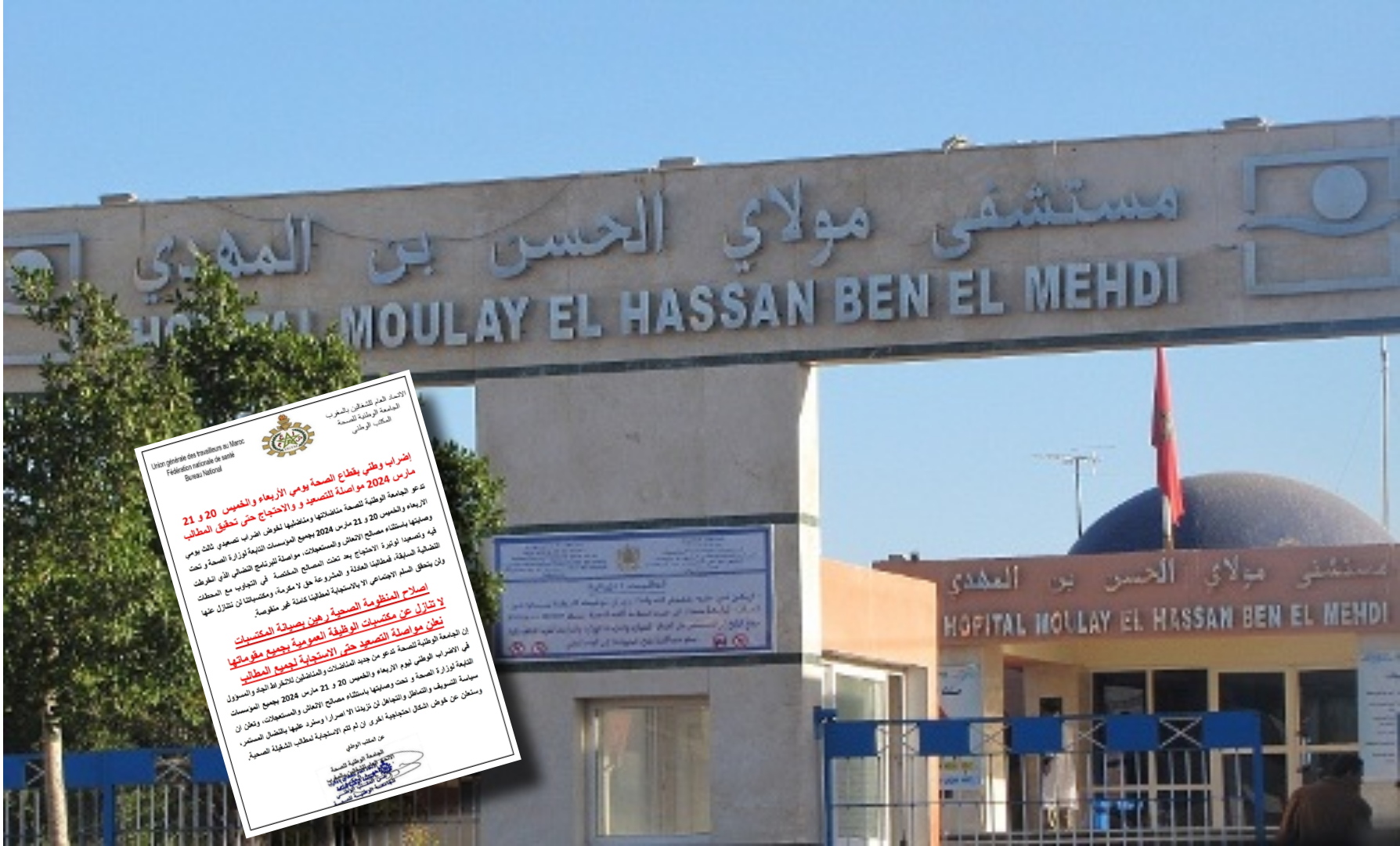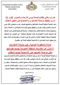 دعت الجامعة الوطنية للصحة كافة مناضلاتها ومناضليها لخوض إضراب تصعيدي يومي الاربعاء والخميس 20 و 21 مارس 2024 بجميع المؤسسات التابعة لوزارة الصحة و تحت وصايتها باستثناء مصالح الانعاش والمستعجلات.