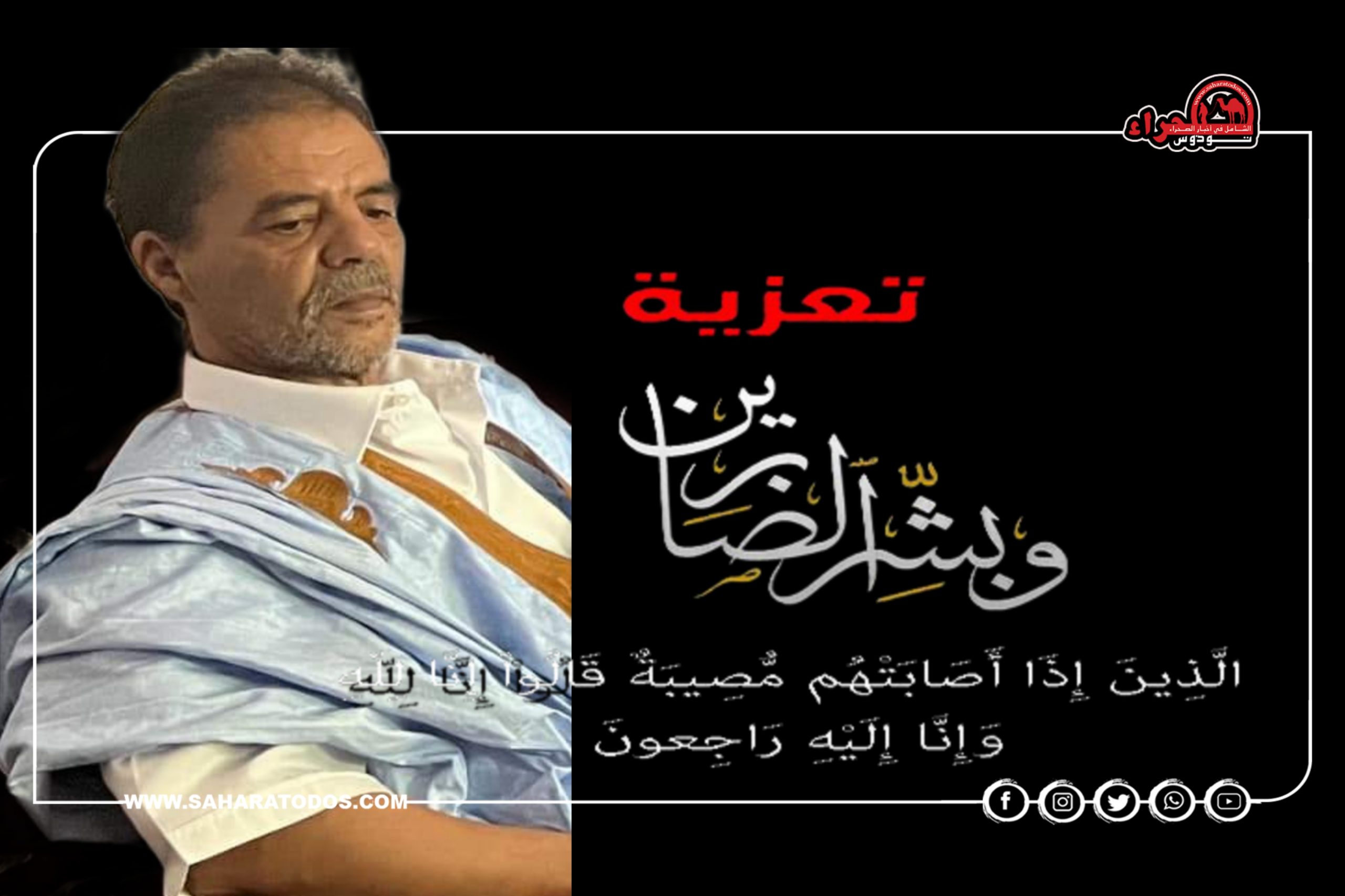 وبهذه المناسبة الأليمة يتقدم طاقم “صحراء توذوس” بأحر التعازي القلبية الصادقة لعائلة “أهل سيدمو ولد بابوزيد” وإلى كل أفراد الأسرة الكريمة، سائلين المولى عز وجل أن يتغمد روح الفقيد الطاهرة برحمته الواسعة وأن يسكنه فسيح جناته ويلهم أهله الصبر والسلوان.