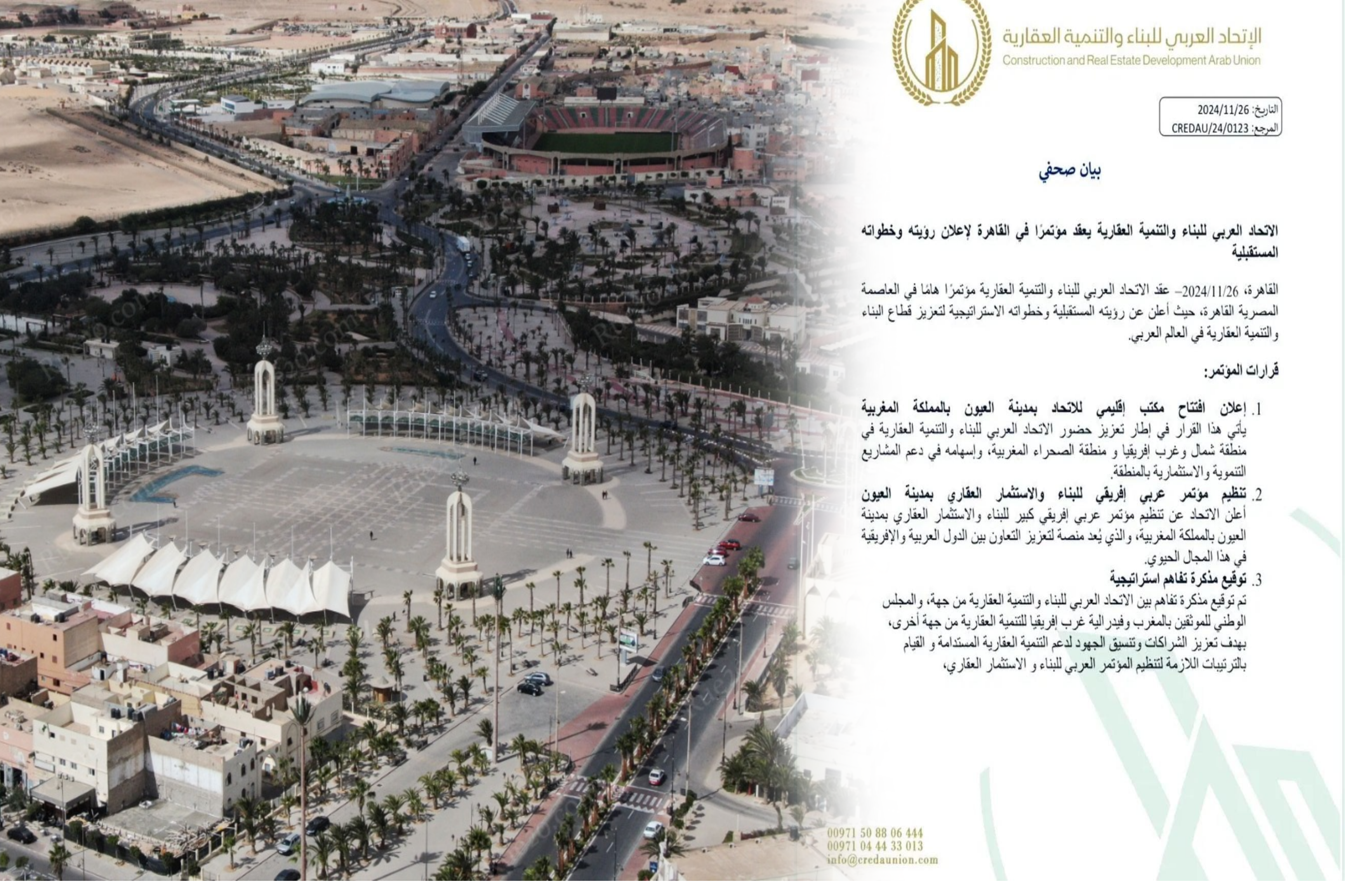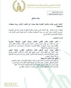 وجاء القرار، خلال مؤتمر عقد بالعاصمة المصرية القاهرة وبرعاية جامعة الدول العربية والذي أطلق رؤية الاتحاد العربي للبناء والتنمية العقارية ومبادراته لعام 2025 تحت شعار لتنمية عقارية عربية.