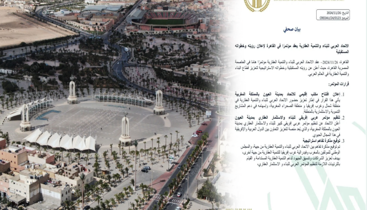 كشف الاتحاد العربي للبناء والتنمية العقارية المتواجد مقره بالقاهرة، عن قرار افتتاح مكتب إقليمي له بمدينة العيون كبرى حواضر الصحراء المغربية.