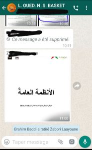 توصلت “صحراء توذوس” بصورة يظهر فيها قيام رئيس عصبة وادنون و الصحراء لكرة السلة براهيم بادي بحذف الزابوري رئيس أمل العيون لكرة السلة بسبب اعتراضه ومحاولته نشر الانظمة العامة على مجموعة الوات ساب للعصبة حسب مايظهر في الصورة .