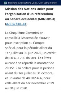 ذكرت مصادر إعلامية مقربة من الأمم المتحدة أن اللجنة الخامسة بالجمعية العامة للأمم المتحدة أوصت اليوم الأربعاء 03 يوليوز 2019 بفتح الحساب الخاص ببعثة الأمم المتحدة للإستفتاء في الصحراء Minurso للفترة من 1 يوليوز إلى 30 يونيو 2020 و بضخ مبلغ 60 مليون و 453 ألف و 700 دولار .