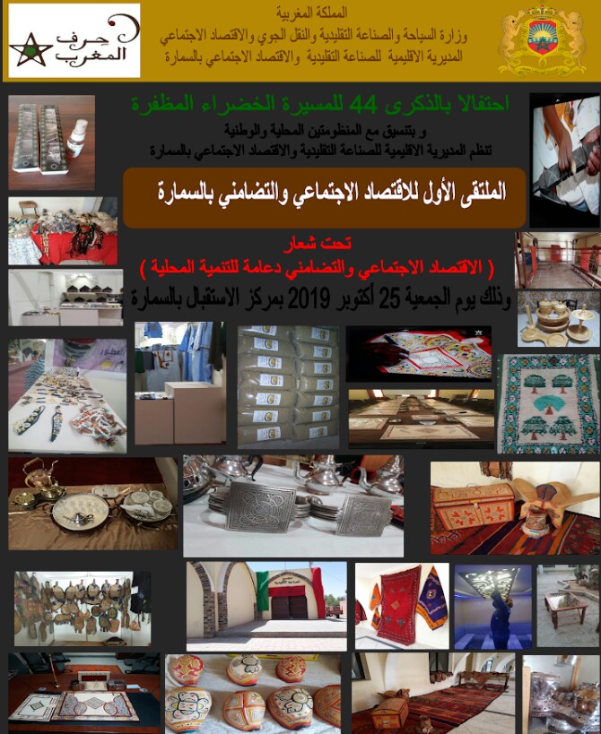 إحتفالا بالذكرى 44 للمسيرة الخضراء المظفرة وبتنسيق مع المنظومتين المحلية والوطنية تنظم المديرية الإقليمية لصناعة التقليدية والإقتصاد الإجتماعي بالسمارة الملتقى الأول للإقتصاد الإجتماعي والتضامني تحت شعار “ الاقتصاد الاجتماعي والتضامني رافعة للتنمية المحلية ” وذلك بقاعة مركز الإستقبال – بمدينة السمارة ، يوم الجمعة 25 أكتوبر 2019، ابتداء من الساعة العاشرة صباحا.