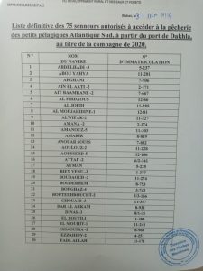 أفرجت وزارة الصيد البحري صباح اليوم الثلاثاء 31 دجنبر 2019 عن لائحة 75 مركبا للصيد الساحلي صنف السردين، التي ستلج مصيدة الأسماك السطحية الصغيرة بالمنطقة “س”، وهذه لائحة المراكب 75
