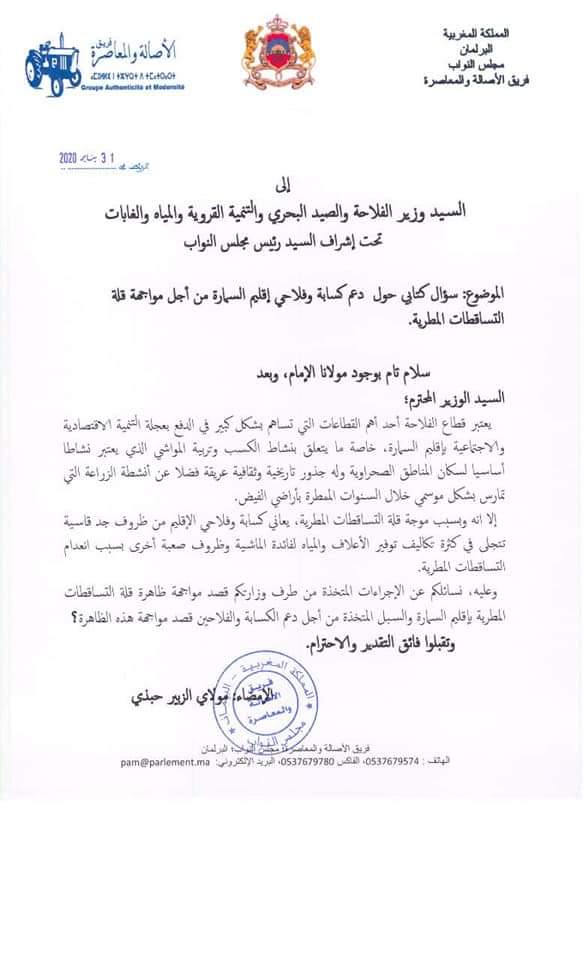 دخل البرلماني عن اقليم السمارة حبدي الزبير على خط الأزمة التي يعاني منها كسابة الإقليم بسبب الجفاف الذي يضرب المنطقة والذي أثر بشكل كبير على معظمهم حيث وجه سؤال كتابي إلى وزير الفلاحة والصيد البحري والتنمية القروية والمياه والغابات حول دعم كسابة وفلاحي إقليم السمارة من أجل مواجهة اثآر الجفاف وقلة التساقطات المطرية وعن الإجراءات المتخذة من طرف الوزارة قصد مواجهة ظاهرة الجفاف .