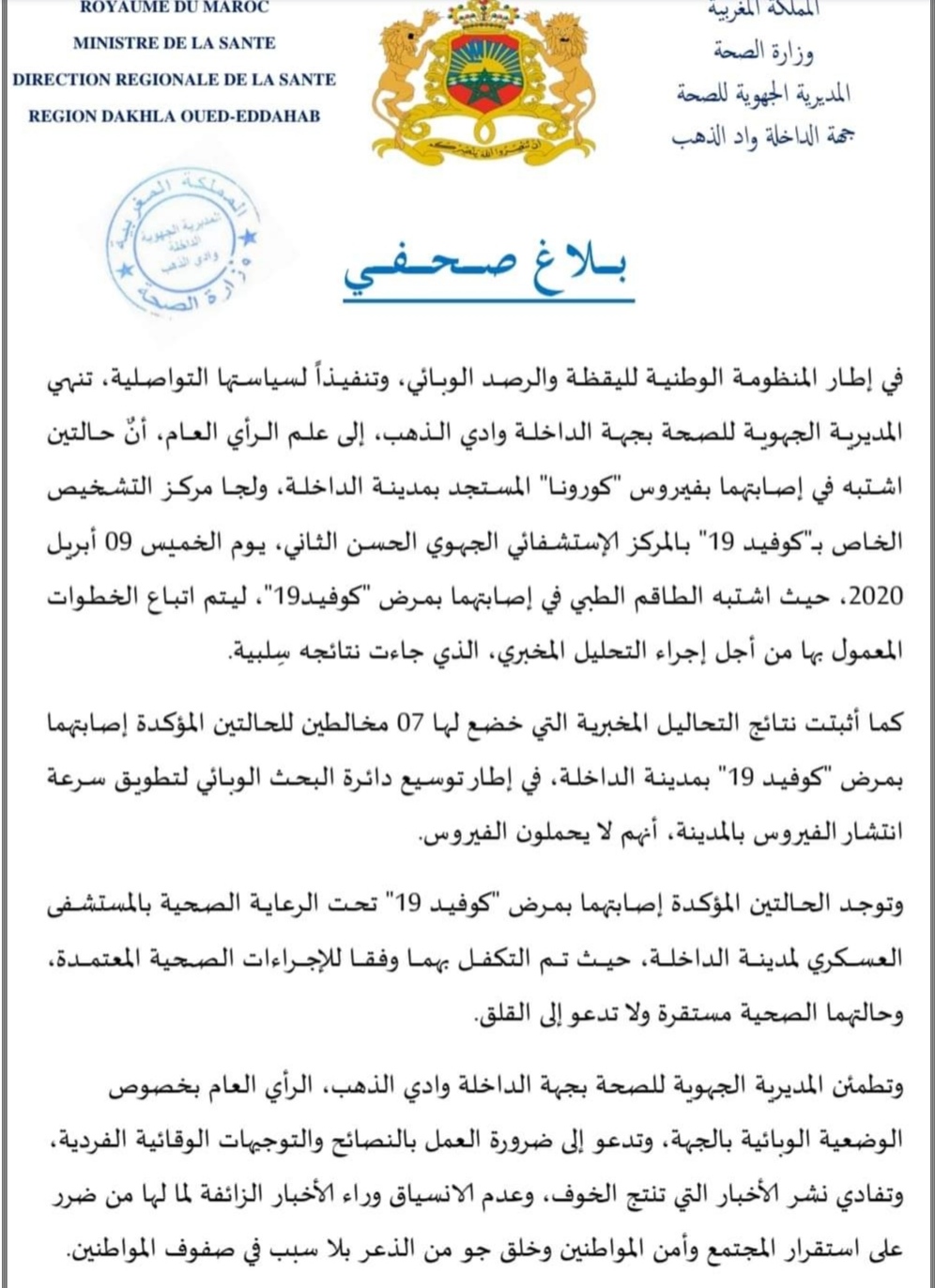 خبر مفرح.. مديرية الصحة بالداخلة التحاليل المخبرية للحالتين سلبية وسبعة مخالطين لايحملون الفيروس
