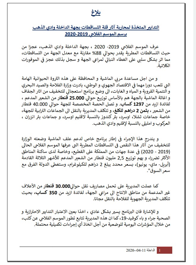 أخبار الصحراء تخصيص 25 ألف قنطار من الشعير المدعم لفائدة مربي الماشية بجهة الداخلة وادي الذهب By admin في أبريل 12, 2020 0 نشر صحراء توذوس الداخلة 0 نشر FacebookTwitterGoogle+WhatsAppالبريد الإلكترونيTelegram