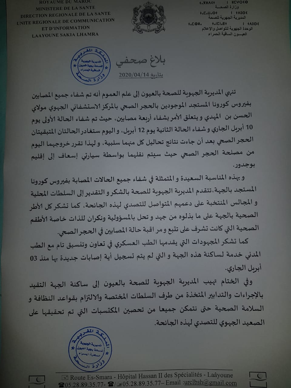جديد الأخبار بلاغ: المديرية الجهوية للصحة بالعيون تعلن شفاء جميع الحالات المصابة بفيروس كورونا By admin في أبريل 14, 2020 0 نشر صحراء توذوس العيون 0 نشر FacebookTwitterGoogle+WhatsAppالبريد الإلكترونيTelegram
