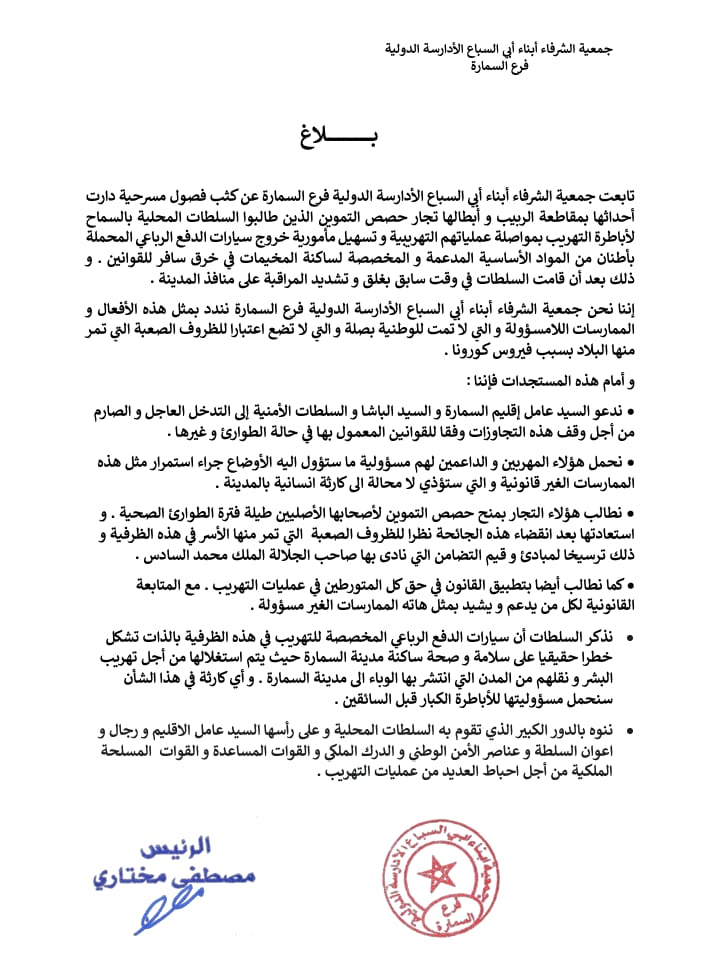 إننا نحن جمعية الشرفاء أبناء السباع الإدارية الدولية فرع السمارة نندد بمثل هذه الأفعال والممارسات اللامسؤولة والتي لا تمت للوطنية بصلة والتي لا تضع اعتبارا للظروف الصعبة التي تمر منها البلاد بسبب فيروس كورونا.