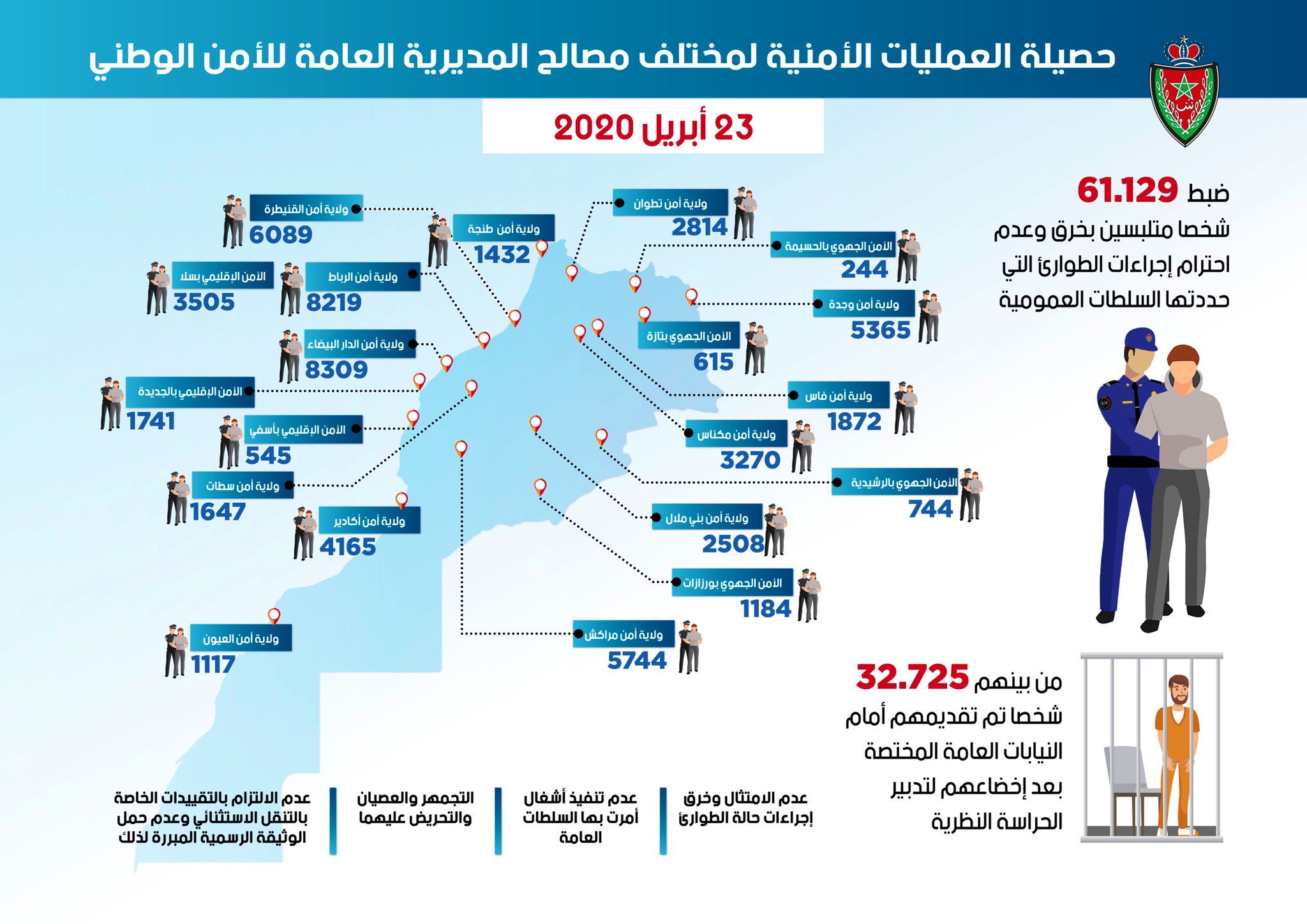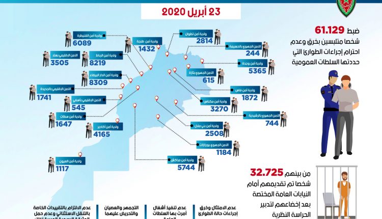 وذكر بلاغ للمديرية العامة للأمن الوطني أن العدد الإجمالي للأشخاص المضبوطين في إطار العمليات الأمنية المنجزة لفرض تطبيق إجراءات حالة الطوارئ، منذ تاريخ الإعلان عنها من طرف السلطات العمومية، بلغ 61.129 شخصا في مجموع المدن المغربية، من بينهم 32.725 شخصا تم تقديمهم أمام النيابات العامة المختصة بعد إخضاعهم لتدبير الحراسة النظرية.